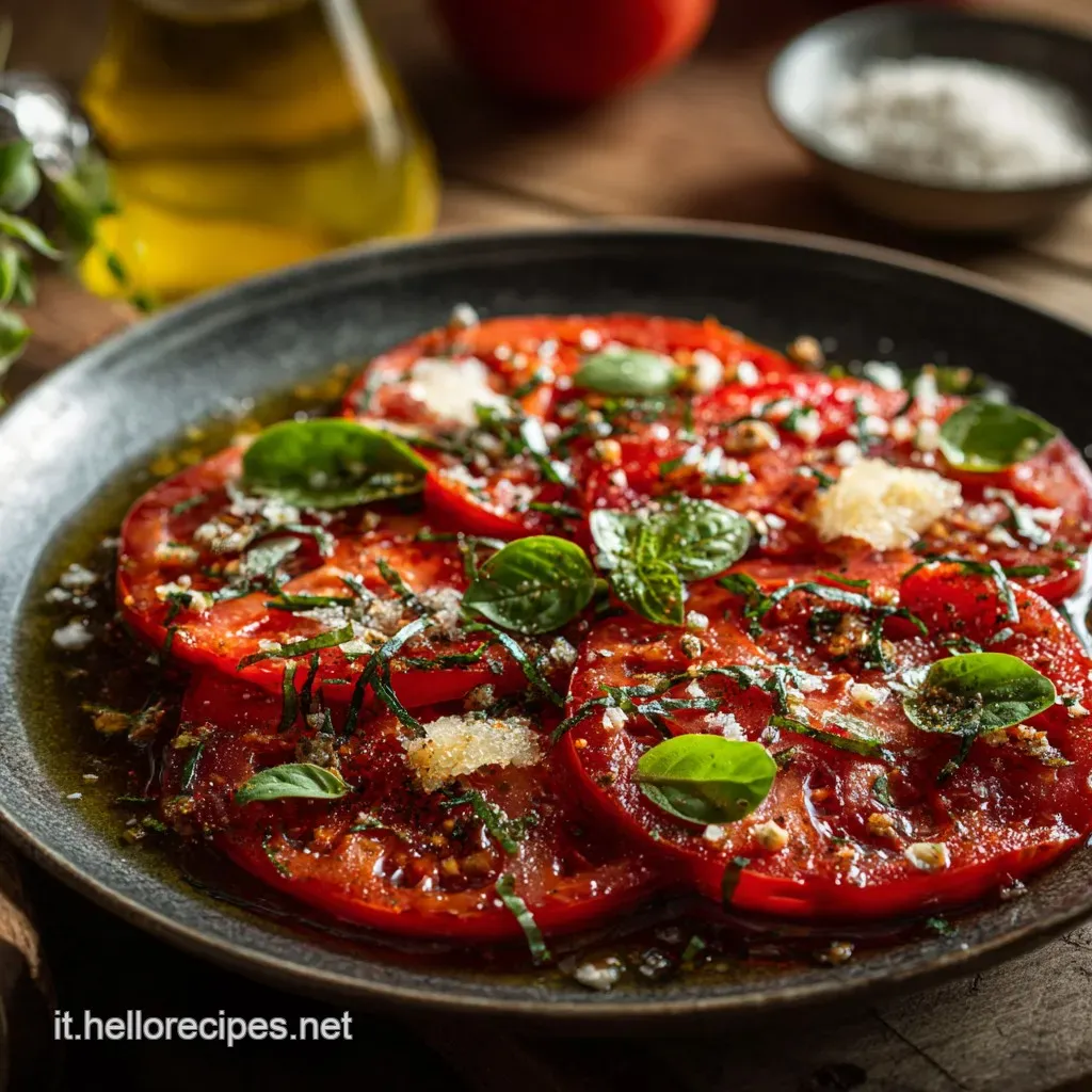 Questo non è un piatto, è un mood . È la risposta italiana, vegetariana e super chic al classico carpaccio di carne. L'ho preparato mille volte. All'inizio lo affogavo nell'olio e il pomodoro mi si afflosciava tipo vecchia spugna. Poi ho capito il trucco.